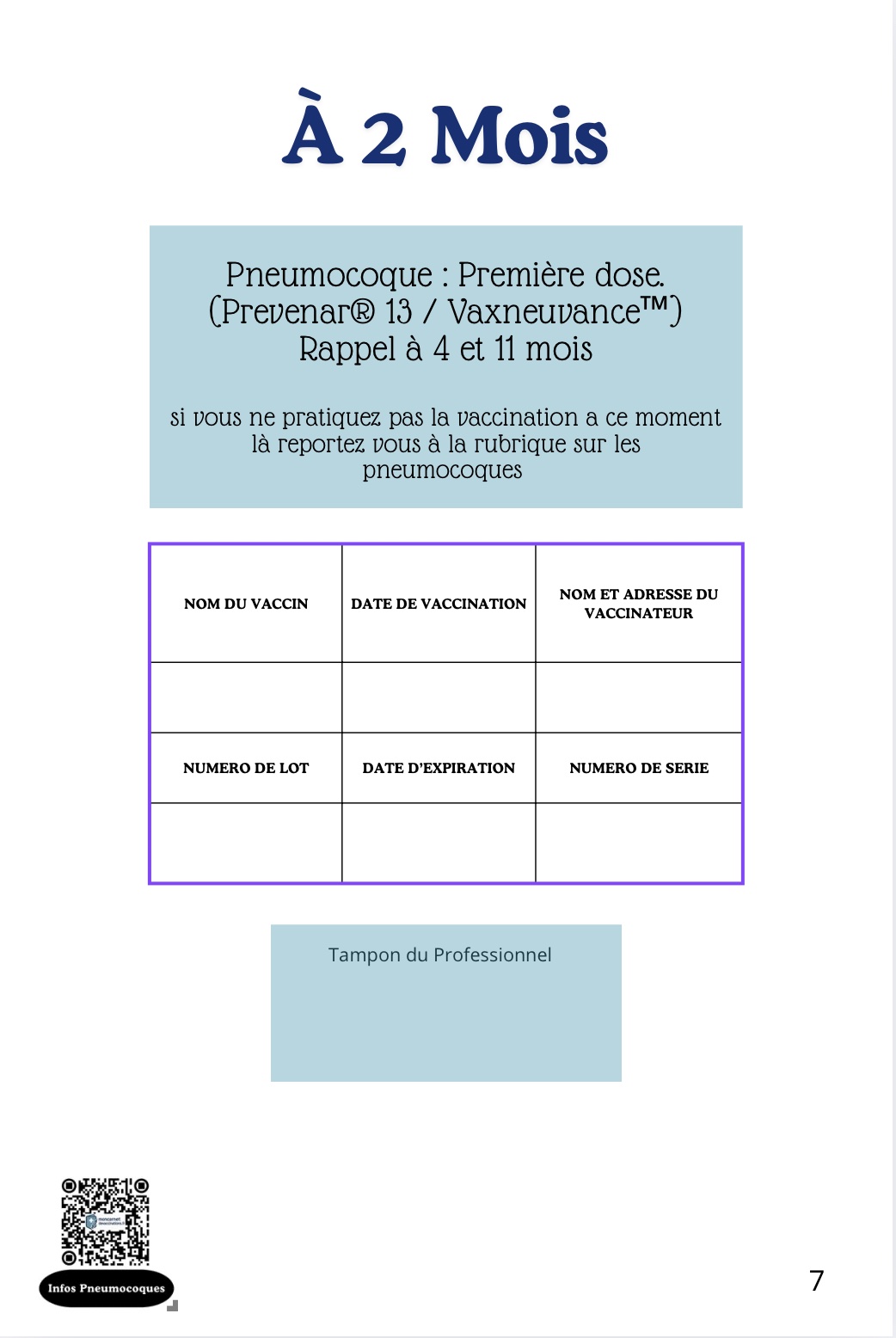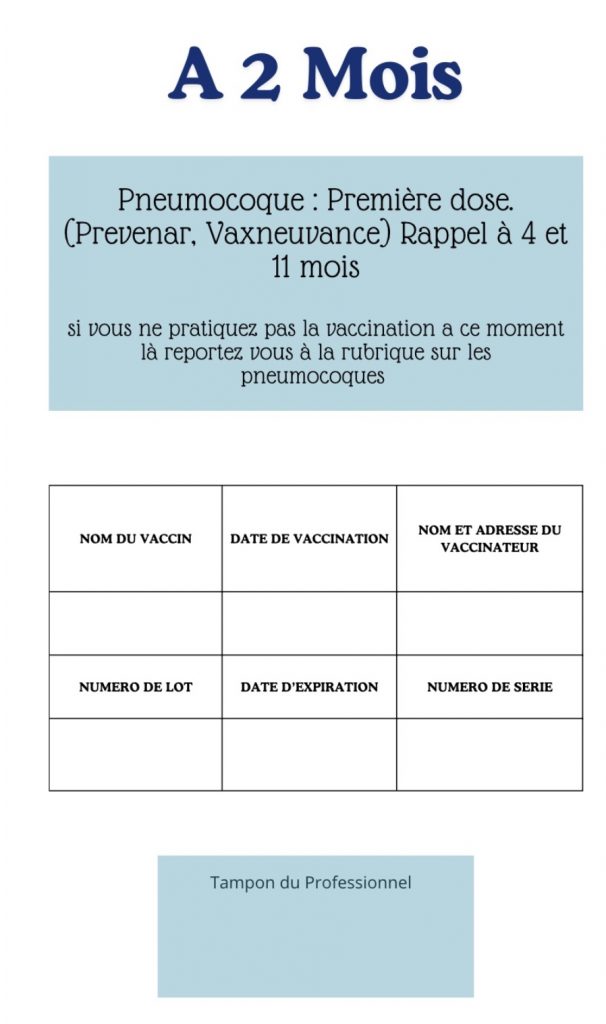 Chaque page reprend un âge et la vaccination correspondante avec le moment du rappel suivant