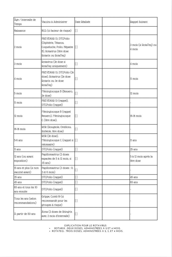 Sur une page, toutes les informations sur la vaccination correspondant à l'âge du patient .